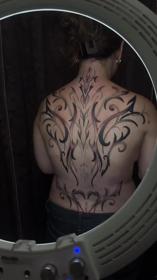 Outside of tattooing you can find her op shopping, absorbing dopamine from spending time with animals, or exploring outdoors.